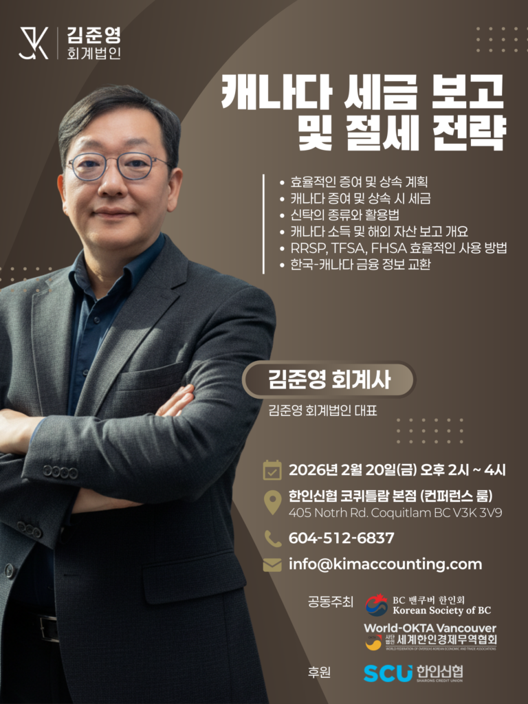 BC밴쿠버한인회는 World-OKTA 밴쿠버와 공동으로 오는 2026년 2월 20일(금) 오후 2시, 코퀴틀람 Sharon’s Credit Union 한인신협 본점 컨퍼런스룸에서 「캐나다