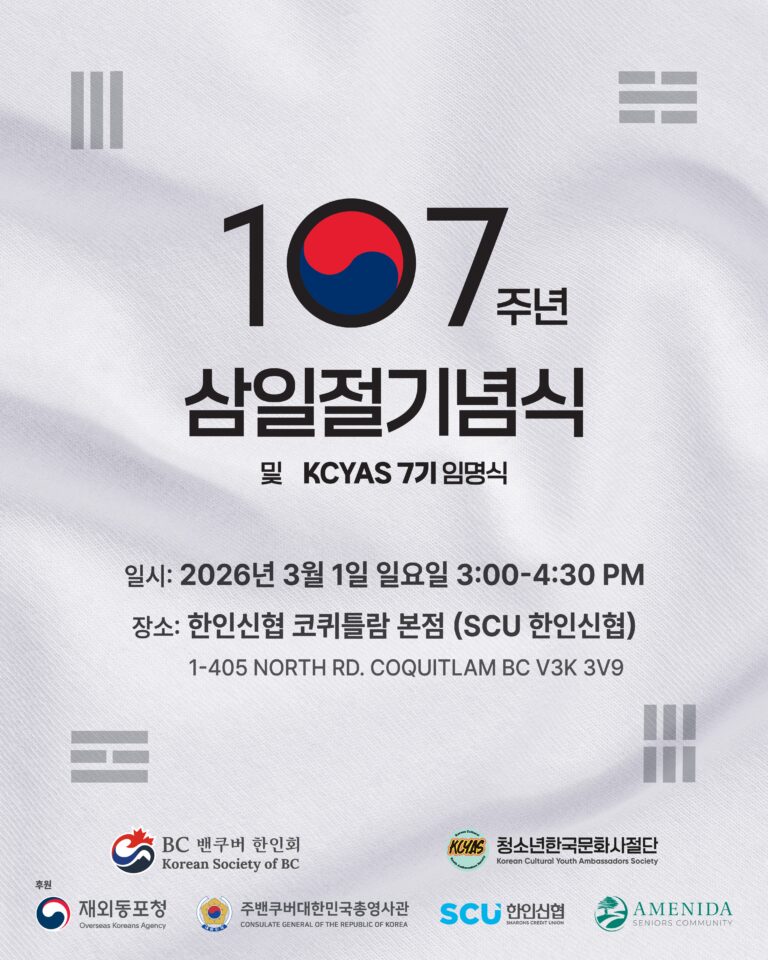 BC밴쿠버한인회는 오는 2026년 3월 1일, 107주년 삼일절 기념식 및 청소년한국문화사절단(KCYAS) 제7기 임명식을 개최합니다. 삼일절은 1919년 3월 1일, 자유와